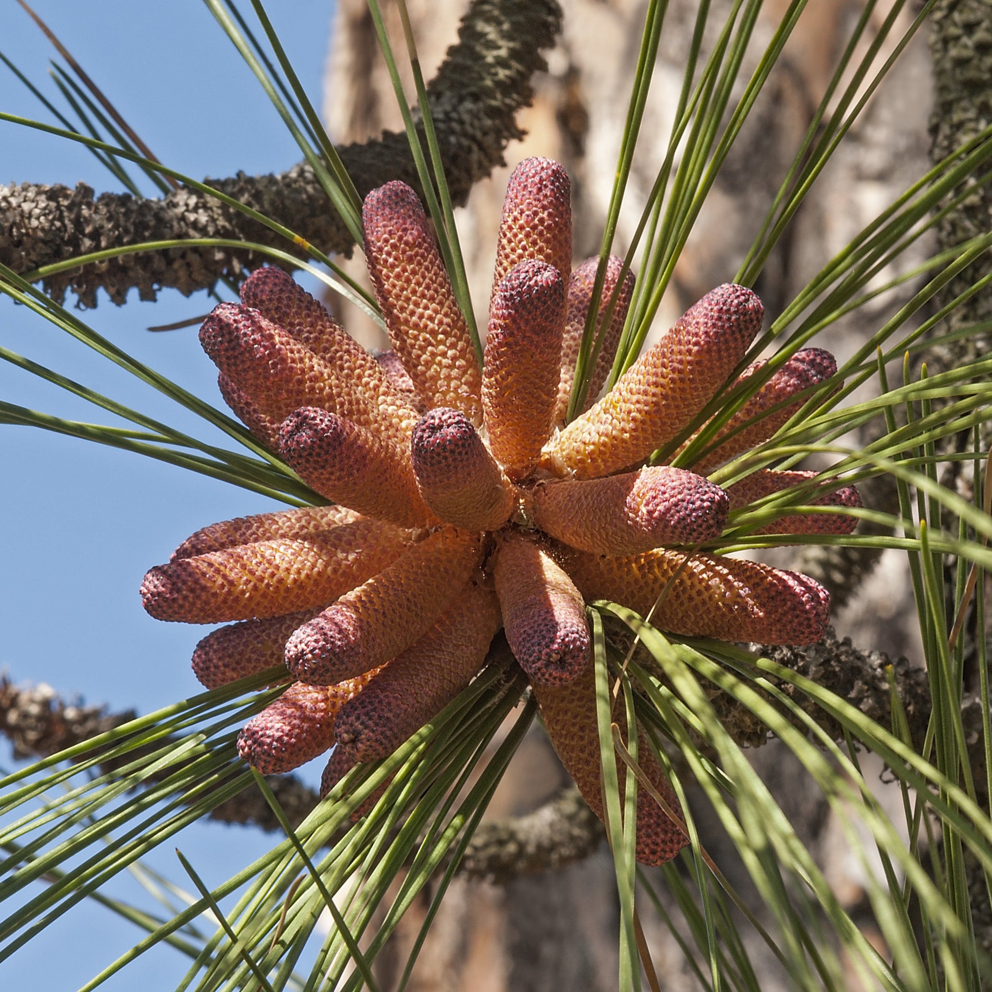 Yellow pollen cones (male); reddish-purple seed cones (female) |